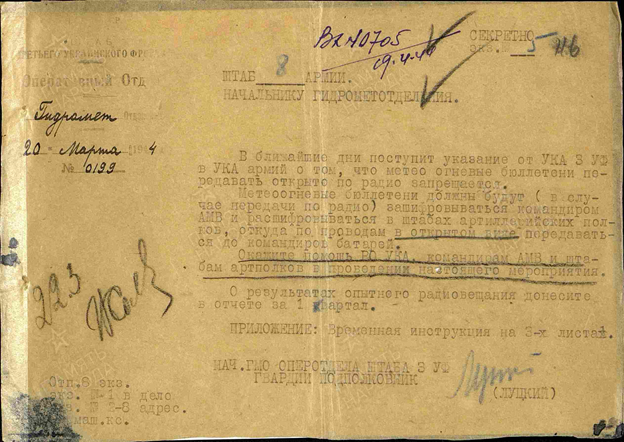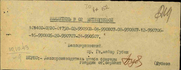 Перед передачей по линии связи метеосводка (в зашифрованном или открытом виде) оформлялась в виде метеобюллетеня: добавлялось ключевое слово «метеоогневой» (или «метеозвук», или «метеозенитный» в зависимости от подразделения), а также номер метеобюллетеня по журналу, позывной метеостанции и фамилия отправителя.
