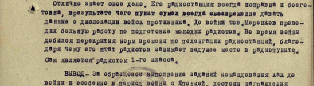 Илл. Фрагмент наградного листа на старшину Меренкова Анатолия Ивановича, начальника радиостанции 2 радиополка «ОсНаз» ГККА