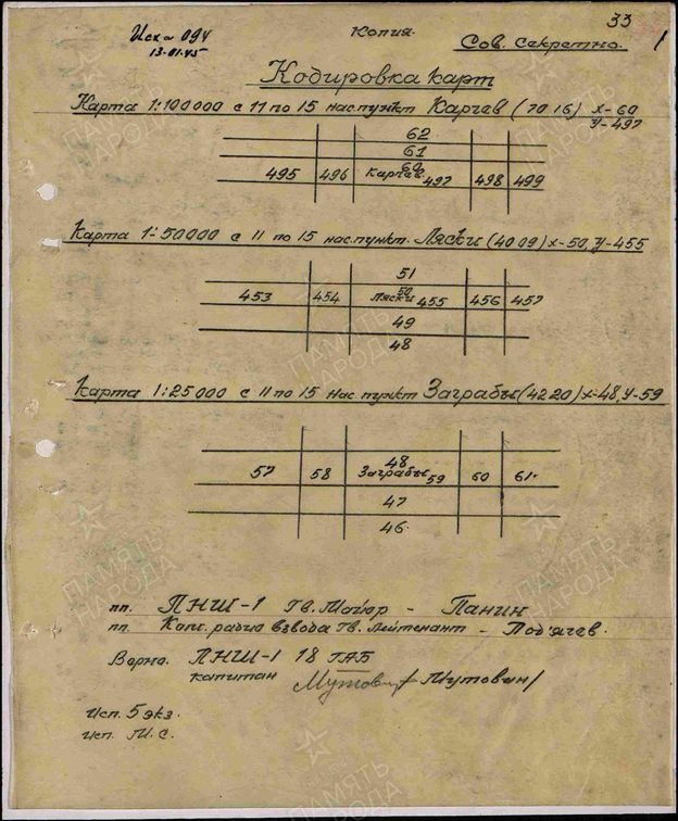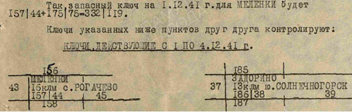 Начальнику тыла корпуса Начальнику штаба артиллерии Начальникам отделов корпуса Сообщаю ключи для кодированной карты масштаба 1:100 000 в сети штаб армии - штабы корпусов, отдельные полки на период 16.1.45 года по 1.2.45 года. Наименование исходного с какого времени ключи пункта действует действующие запасной Хмедьник коорд. 0882 с 00 часов 16.1. о94/42 573/48 Лукова коорд. 2066 с 00 часов 19.1. 628/54 402/44 Пенчув коорд. 9866 с 00 часов 22.1 246/52 726/58 г. дв. Дешно коорд.0838 с 00 часов 25.1 185/48 835/62 Малогощ коорд. 3048 с 00 часов 28.1.45г. 336/50 901/46 Примечание: ключи развивать -числитель по вертикали с Юга на Север знаменатель с Запада на Восток по возрастающей Начальник 6 отдела штаба 6 Гв. Т.К. Гвардии майор Шомин