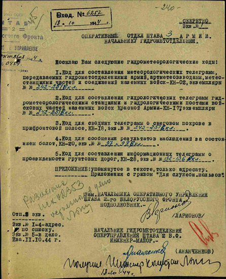 В целях укрепления существующего кода "ЗЕНИТ" разработан новый код "НОРД". Введение его в действие будет осуществлено порядком, указанным в правилах пользования. Начальник штаба ВВС западного фронта приказал: 1. обеспечить рассылку прилагаемого кода из расчета по одному коду на метеостанцию. 2. Донести о готовности и работе настоящим кодом