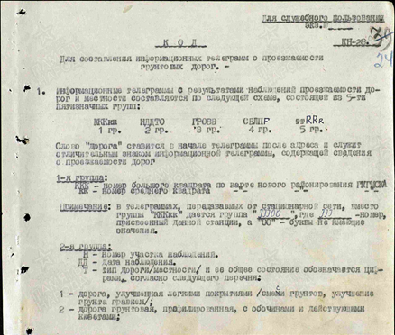 Замечание. В документе, в котором предписано использовать код КН-02 с некоторыми изменениями, указано, что координаты постов в метеосводках шифруются всегда, а остальные группы метеосводки – только при передаче по радио. Также даны предписания и по использованию отличительных слов («ромб» и др.). Из документа от 11.10.44: код КН-02 используется для составления метеорологических телеграмм, передаваемых гидрометеотделениями армий, артметеовзводами, метеостанциями частей и соединений наземных войск;